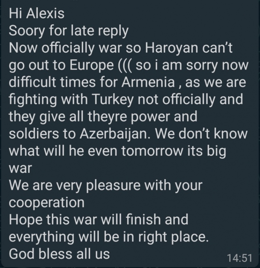Πριν από λίγα λεπτά ο μάνατζερ του αρχηγού της εθνικής Αρμενίας Haroyan μας ενημέρωσε ότι η μεταγραφή του παίκτου στην ΑΕΛ ματαιώνεται, τουλάχιστον για αυτή την μεταγραφική περίοδο, γιατί ο ποδοσφαιριστής όπως και όλοι οι Αρμένιοι πολίτες μέχρι 40 ετών επιστρατεύτηκαν και ήδη ευρίσκεται στο πεδίο των μαχών.