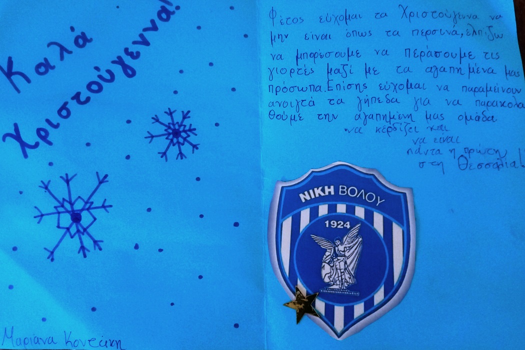 Η ηρωίδα της ιστορίας μας, η Μαριάννα, μαθήτρια της Ε’ Δημοτικού επέλεξε έναν άκρως… “κυανόλευκο” τρόπο να εξωραΐσει την δική της κάρτα, ευχόμενη το 2022 να μην κλείσουν τα γήπεδα, προκειμένου η Νίκη να είναι η πρώτη ομάδα της Θεσσαλίας, με τη βοήθεια του κόσμου της!