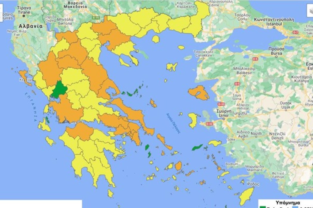Συγκεκριμένα, στο πορτοκαλί επίπεδο ετοιμότητας βρίσκονται 28 Περιφερειακές Ενότητες: Κιλκίς, Θεσσαλονίκης, Φλώρινας, Κοζάνης, Ιωαννίνων, Γρεβενών, Λάρισας, Μαγνησίας, Αιτωλοακαρνανίας, Βοιωτίας, Εύβοιας, Αχαΐας, Κέρκυρας, Χανίων, Ρεθύμνου και Ηρακλείου Κρήτης, Νάξου, Τήνου, Άνδρου, Μυκόνου, Καλύμνου, Λέσβου, καθώς και οι Περιφερειακές Ενότητες της Αττικής (πλην της Περιφερειακής Ενότητας νήσων).