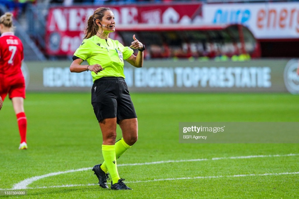 ENSCHEDE, NETHERLANDS - AUGUST 31: referee Eleni Antoniou during the UEFA Women's Champions League 2021/2022 Second Qualifying Round match between FC Twente and SL Benfica at Grolschveste on August 31, 2021 in Enschede, Netherlands (Photo by Albert ten Hove/BSR Agency/Getty Images)