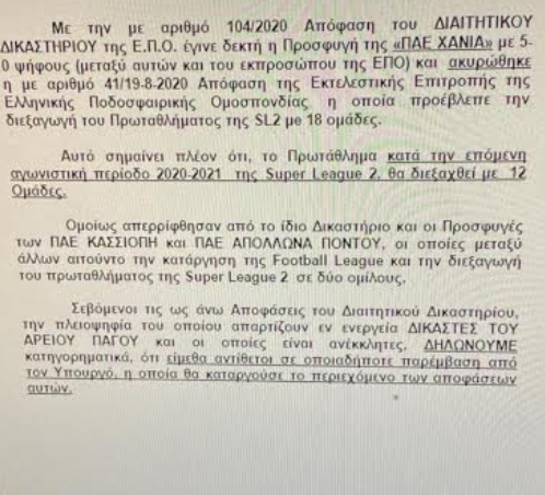 Σύμφωνα με την απόφαση …του ΔΙΑΙΤΗΤΙΚΟΥ ΔΙΚΑΣΤΗΡΙΟΥ της Ε.Π.Ο. έγινε δεκτή η προσφυγή της «ΠΑΕ ΧΑΝΙΑ» με 5-0 ψήφους (μεταξύ αυτών και του εκπροσώπου της ΕΠΟ) και ακυρώθηκε η… απόφαση της Εκτελεστικής Επιτροπής της Ελληνικής Ποδοσφαιρικής Ομοσπονδίας, η οποία προέβλεπε την διεξαγωγή του Πρωταθλήματος της SL2 με 18 ομάδες.
