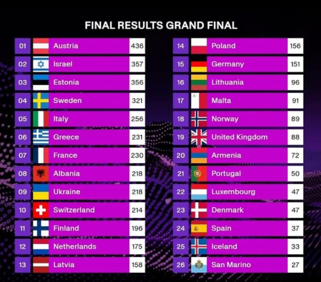 Ολοκληρώθηκε ο Μεγάλος Τελικός του 69ου Διαγωνισμού Τραγουδιού της Eurovision το βράδυ του Σαββάτου στη Βασιλεία της Ελβετίας με την Αυστρία και τον τενόρο JJ να βρίσκεται στην πρώτη θέση και την Ελλάδα με την Κλαυδία και την “Αστερομάτα” στην 6η θέση.