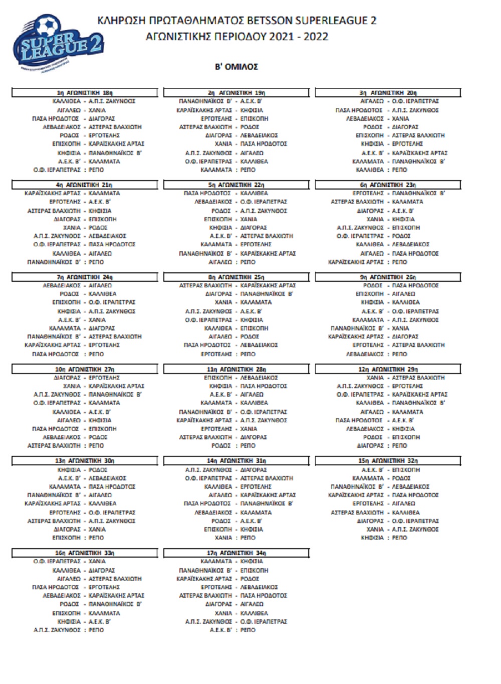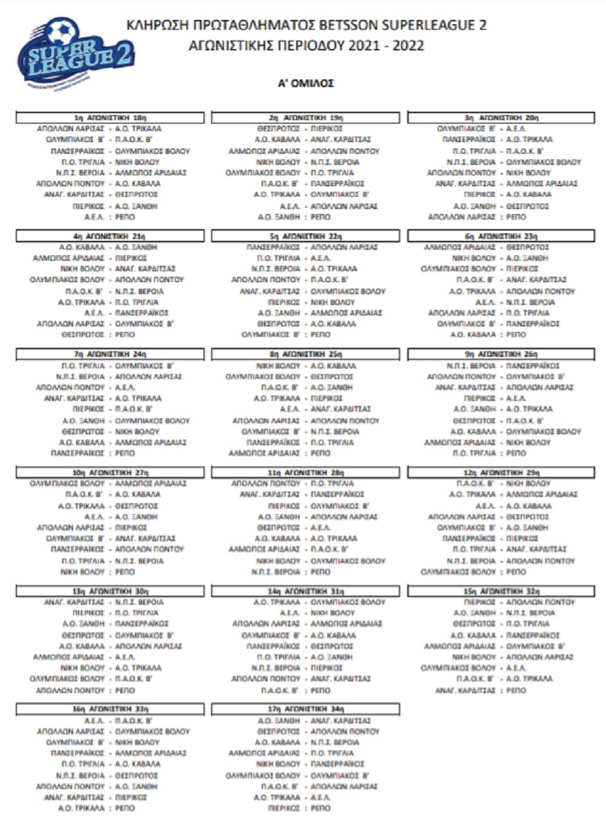 Δείτε το αναλυτικό πρόγραμμα του Α΄ ομίλου και του Β’ ομίλου της Betsson Super League 2 για τη σεζόν 2021-22.