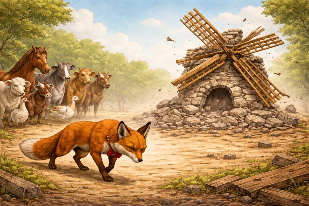 Κάθε τόσο ίσιωνε το παπιγιόν της και συνέχιζε να μιλά, προσπαθώντας να πείσει τους πάντες. Τα ζώα όμως έβλεπαν, καταλάβαιναν πως τίποτα δεν πάει σωστά, μα σώπασαν. Κρατούσαν μια μικρή ελπίδα, κι ας ήξεραν μέσα τους την αλήθεια. Κι εκείνοι που πραγματικά ήξεραν, περίμεναν, γιατί γνώριζαν πως η αλήθεια δεν κρύβεται για πάντα. Ώσπου ήρθε η ώρα, ένα φύσημα αέρα την πιο κρίσιμη στιγμή και ο μεγάλος κόκκινος μύλος που υποσχέθηκε, κατέρρευσε με κρότο.