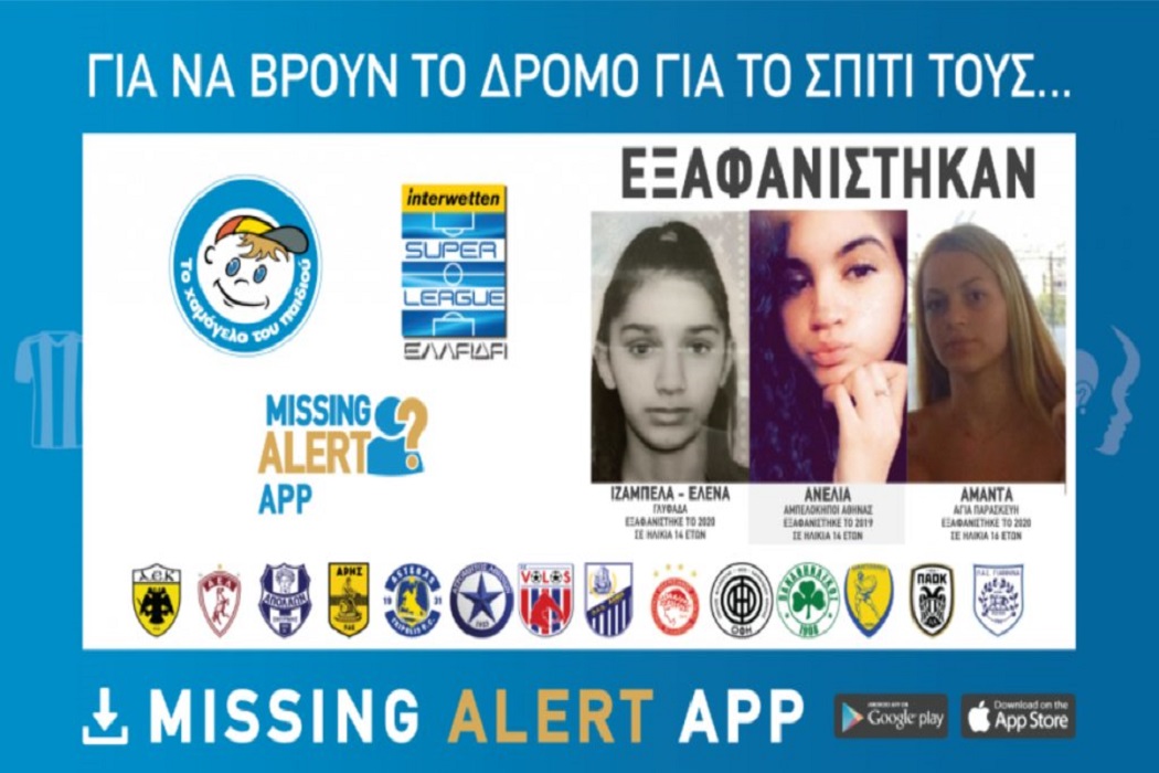 Με αφορμή την Παγκόσμια ημέρα για τα εξαφανισμένα παιδιά στις 25 Μαΐου, οι ποδοσφαιριστές όλων των ομάδων της Super League στέλνουν μέσω ενός βίντεο, μήνυμα αλληλεγγύης, σεβασμού, αλλά και αρωγής στις έρευνες εντοπισμού αγνοουμένων συνανθρώπων μας, μέσω μιας εφαρμογής για κινητά τηλέφωνα, του MISSING ALERT APP.